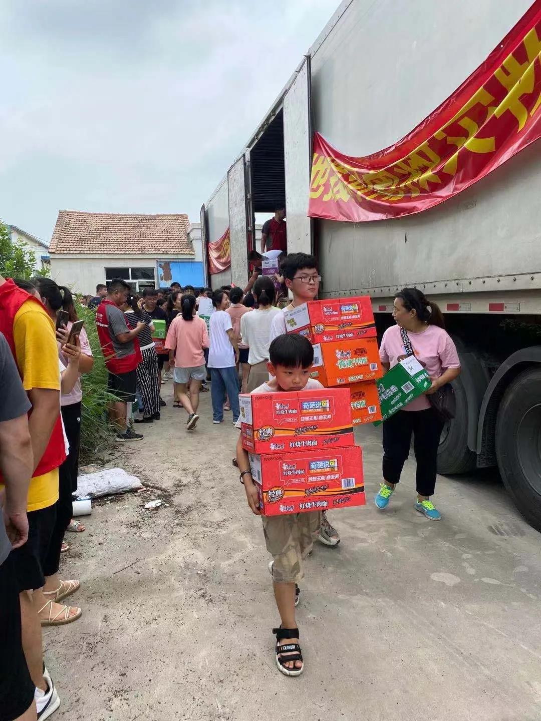 一辆满载纯净水和食品等抗洪救灾物资的卡车,