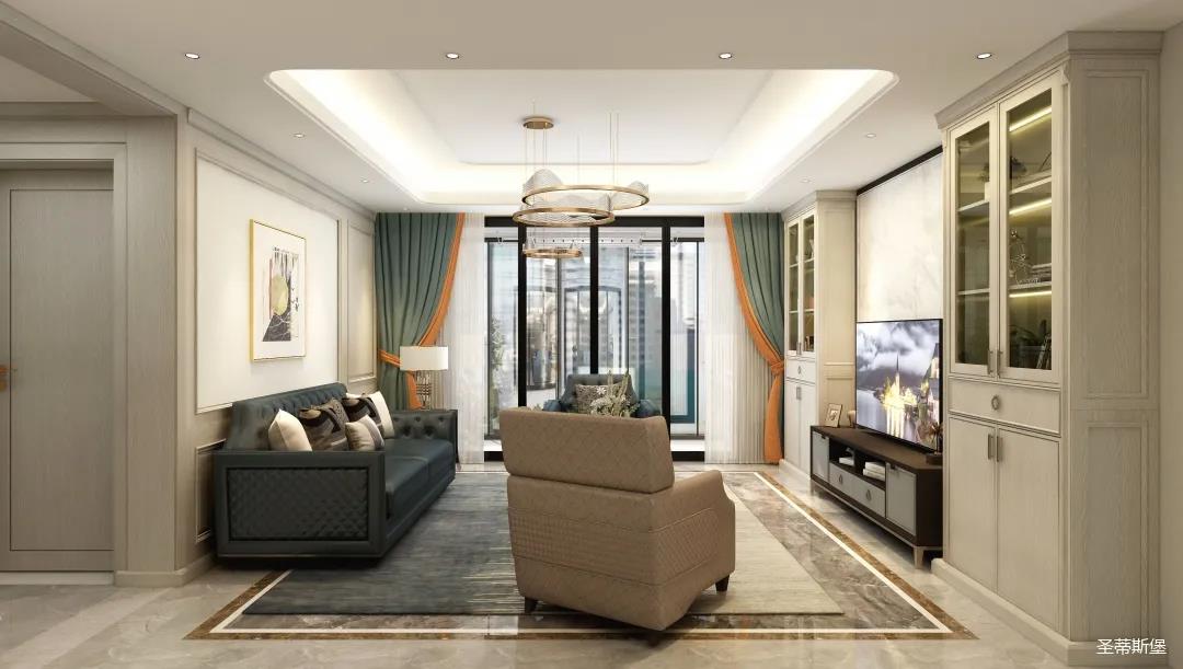 ▲室内的环形水晶吊灯,让空间明亮而高级,淡雅内敛的洛卡灰,在些许爱马仕橙的亮色点缀下,让空间色彩跳脱又灵动。飘窗设计,使光线毫无保留的散落空间,卧室通过自然光线与实木的洗礼,充满着温暖阳光的气息。